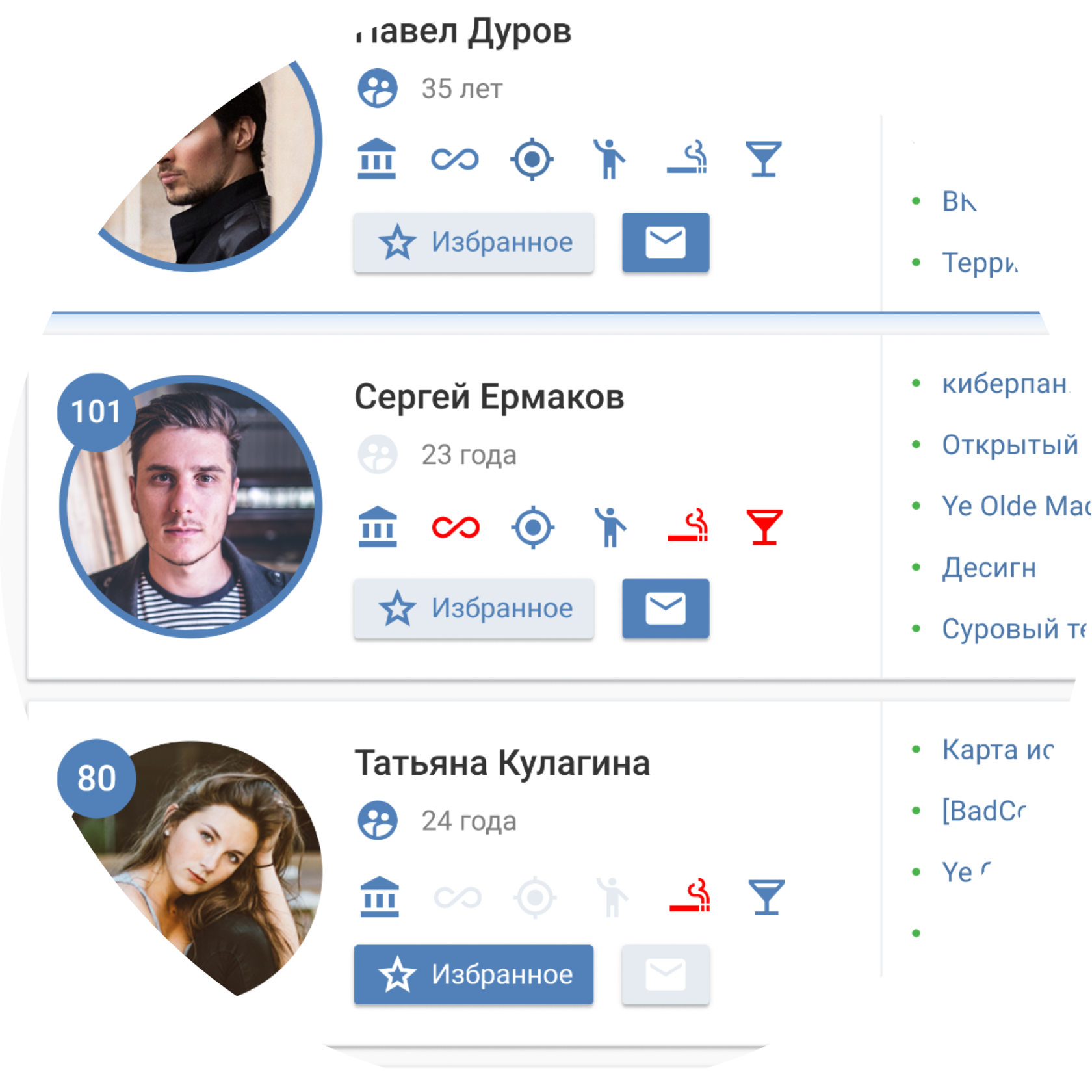 Состоит из карточек с подробной информацией о мировоззрении, вредных привычках, семейном положении,